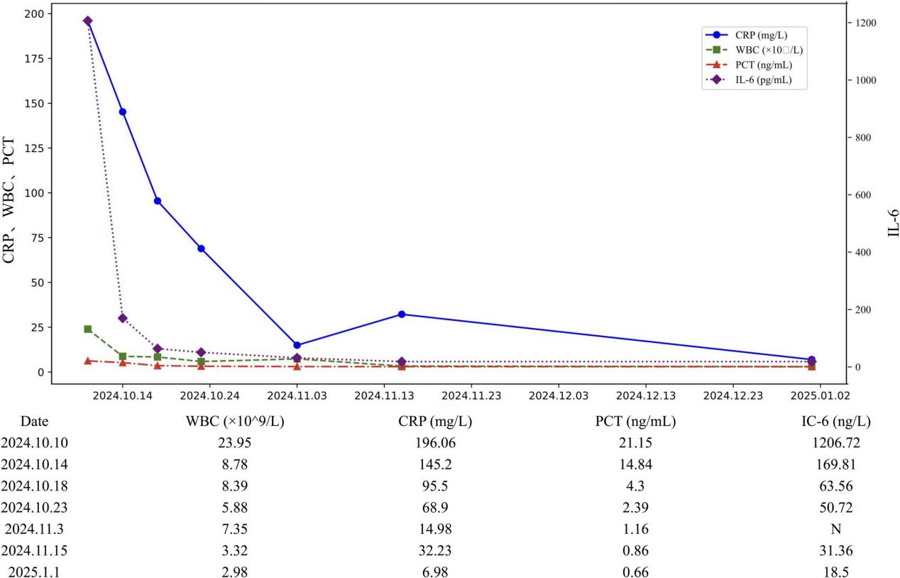 鉴于患者主动脉溃疡情况,及时邀请血管外科会诊。会诊提示存在手术指征,但经仔细考虑后,患者家属拒绝手术干预,选择保守治疗。此后,患者继续既定抗生素方案。住院第 20 天,血培养检出白色念珠菌,据此,加用氟康唑抗真菌治疗5天,负荷剂量400mg,随后每日200mg。经过一段时间的治疗,患者后续的炎症标志物呈下降趋势(炎症标志物的详细时间线见图3)。在此期间,患者腰痛、腹痛等症状逐渐改善。2024年11月21日,患者达到出院标准并办理出院手续。