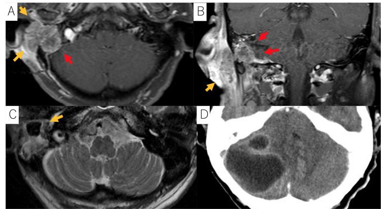 图1 A、 B:磁共振成像(MRI)T1加权钆增强图像显示肿瘤(由黄色箭头和红色箭头表示)。此外,图像显示肿瘤侵入右乙状窦和硬脑膜(由红色箭头表示)。根据改良的匹兹堡分类法,该肿瘤被归类为T4。无颈部淋巴结转移或远处转移。C:MRI T2加权图像显示右颞骨破坏,在放射治疗(RT)后七年观察到(由黄色箭头表示)。D:计算机断层扫描(CT)显示右小脑有一个低密度区域的环状增强病变,与放疗后8年出现的小脑脓肿一致。脓肿的最大尺寸为43毫米。通过引流和抗生素治疗进行了治疗。患者没有复发或随后形成脑脓肿