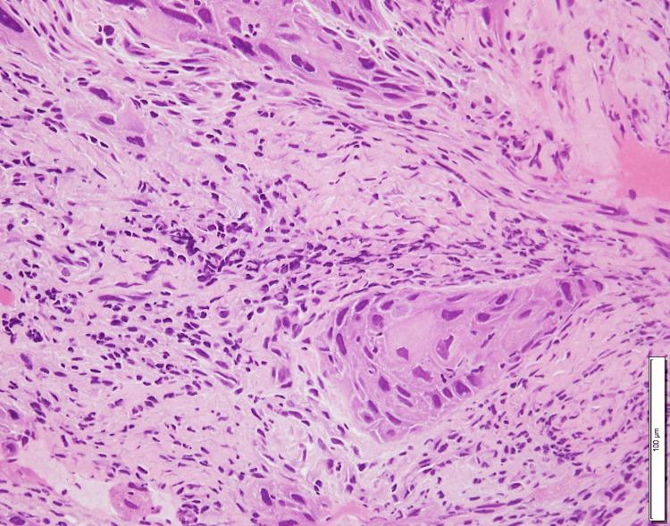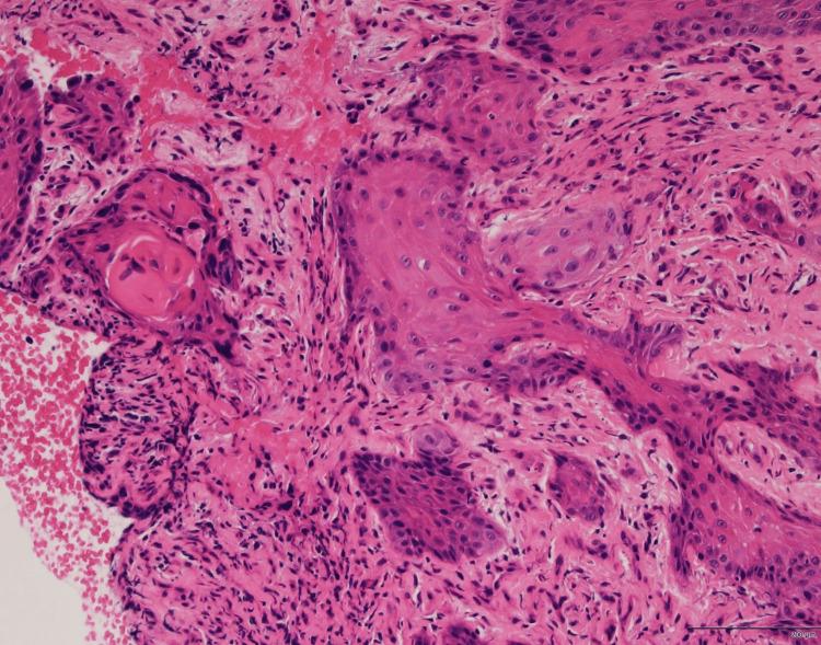 图2 标本苏木精和伊红染色显示非典型鳞状上皮侵入基质,证实了分化良好的鳞状细胞癌的诊断