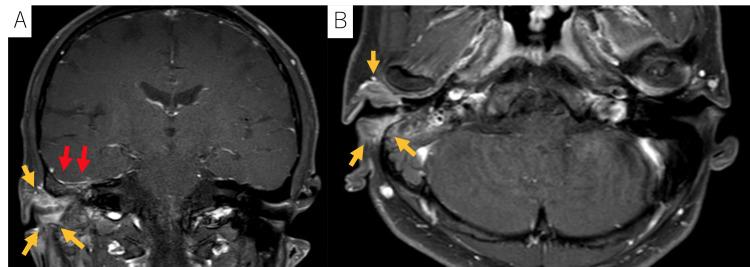 图4 A、 B:MRI图像显示肿瘤(由黄色箭头表示)和右中颅窝硬脑膜增强(由红色箭头表示)。根据改良的匹兹堡分类法,该疾病被归类为T4。患者无颈部淋巴结受累或远处转移