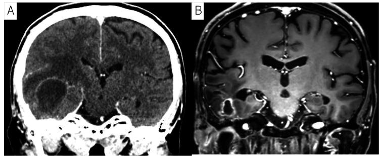图5 A: CT扫描显示右颞叶有一个低密度区域的环状强化病变,与颞叶脓肿一致,最大36毫米。脑脓肿在放疗后两个月形成。B:尽管进行了引流和抗生素治疗,脑脓肿仍然存在