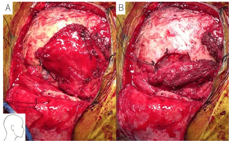 图6 为了治疗脓肿,进行了部分颞叶切除术。A:切除脑脓肿后,创建了带蒂颞肌瓣。B:皮瓣位于硬脑膜和颅底之间。患者仍然活着,没有复发或随后形成脑脓肿