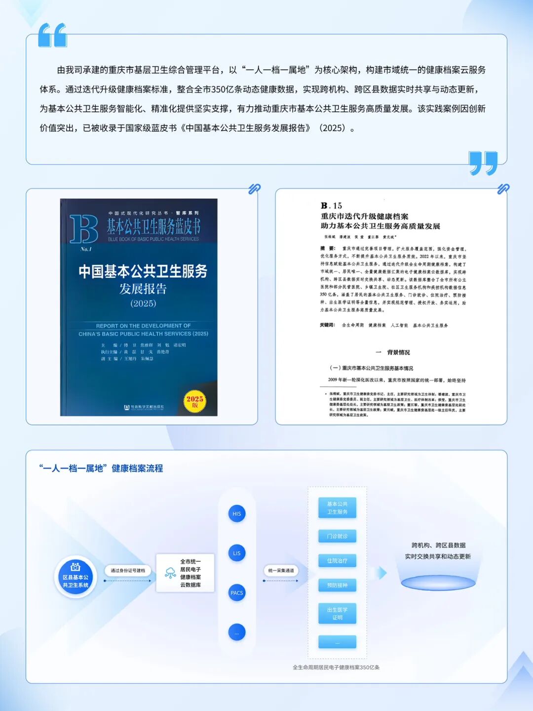 这一“全生命周期健康档案赋能全民健康服务”的创新实践,不仅入选国家级典型案例,更于2025年5月在瑞士日内瓦举行的世界卫生大会中国边会上向全球展示,为用数字技术促进全民健康覆盖提供了宝贵的“中国经验”和“重庆方案”。这场以数据破壁为核心的改革,真正实现了让“数据多跑路,群众少跑腿,健康常守护”的愿景。